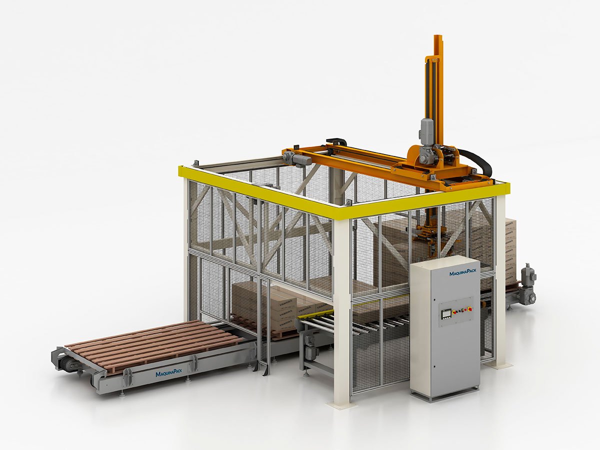 - Magazine de alimentação de pallets automático, ajustável para diversos tamanhos de pallet.